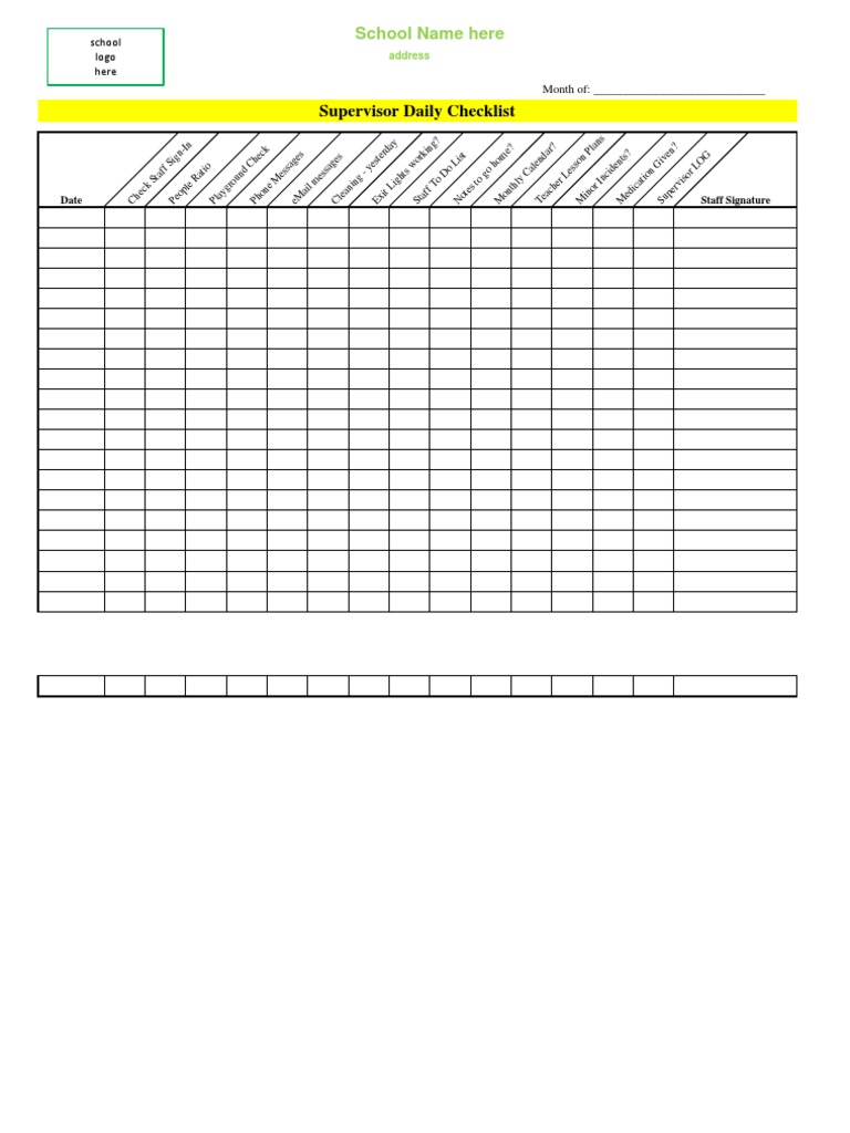 Daily Checklist For Supervisors. Complete checklist items daily for the first week. Roperty check (evaluating safety 4 supervisors are vigilant and observed actively coaching employees when appropriate. If you want to create a supervision checklist, here are some of the things. Task alert functional groups of new hire. For example, developing a comprehensive written appraisal.